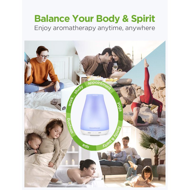 - Romantic Mood Light: InnoGear essential oil diffuser has 8 soothing colors, light can switch from dim to bright. Great for creating atmosphere, meditation, or using as a night light.