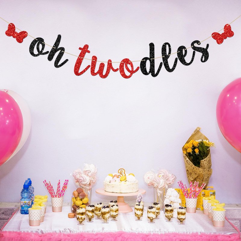 INNORU Oh Twodles Banner, Happy 2nd Birthday Party Hanging Decor for Boys Girls - Cartoon Mouse Theme 2nd Birthday Party Decorations Supplies Banner, Red & Black Glitter