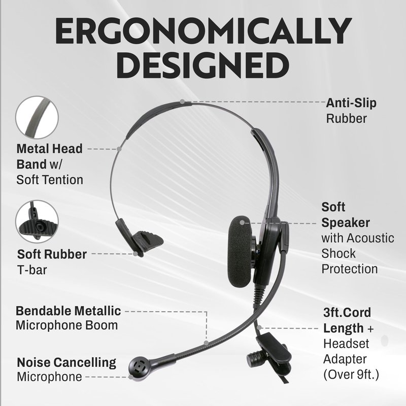 Compatible with Cisco Phones' RJ9 Headset Port. Classic style design, cost effective superior durable headset is focusing on Telemarketing service. The superior durability of the Classic Monaural headset provides long lasting value under the most telephone-intensive conditions and cost-effective solution to customer call centers. Easily stay-put click-stop headband and soft Rubber T-bar supports all-day long comfortable wearing. With your office phone system, Static shock protecting Noise cancelling mic delivers reduced background noise in a noisy office while enjoying additional productivity keeping both hands free. The flexible goose-neck mic boom allows you to get an optimal positioning from the mouth and the large ear cushion blocks surrounding noise outstanding