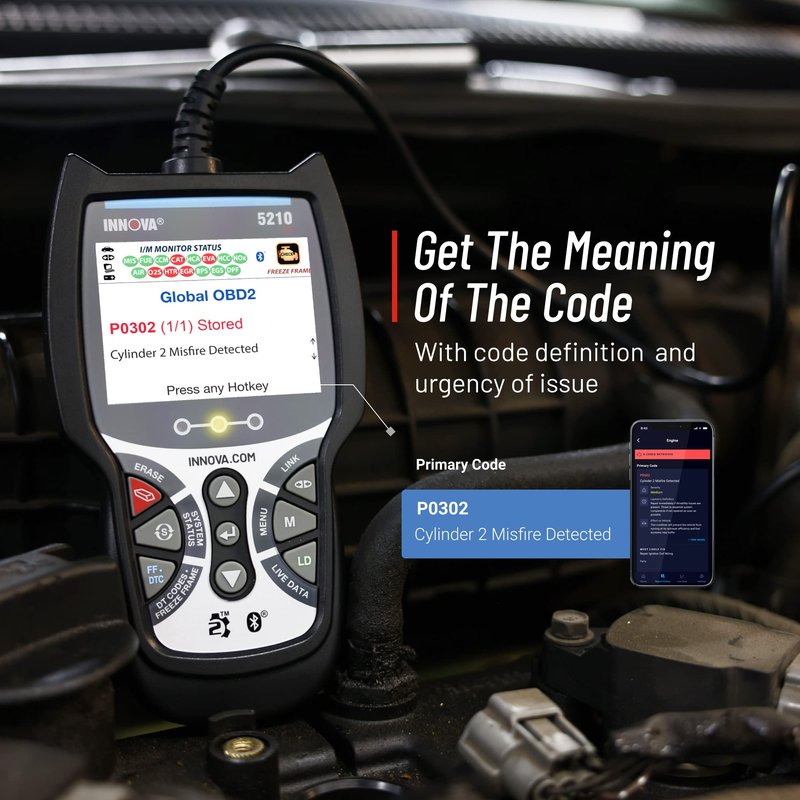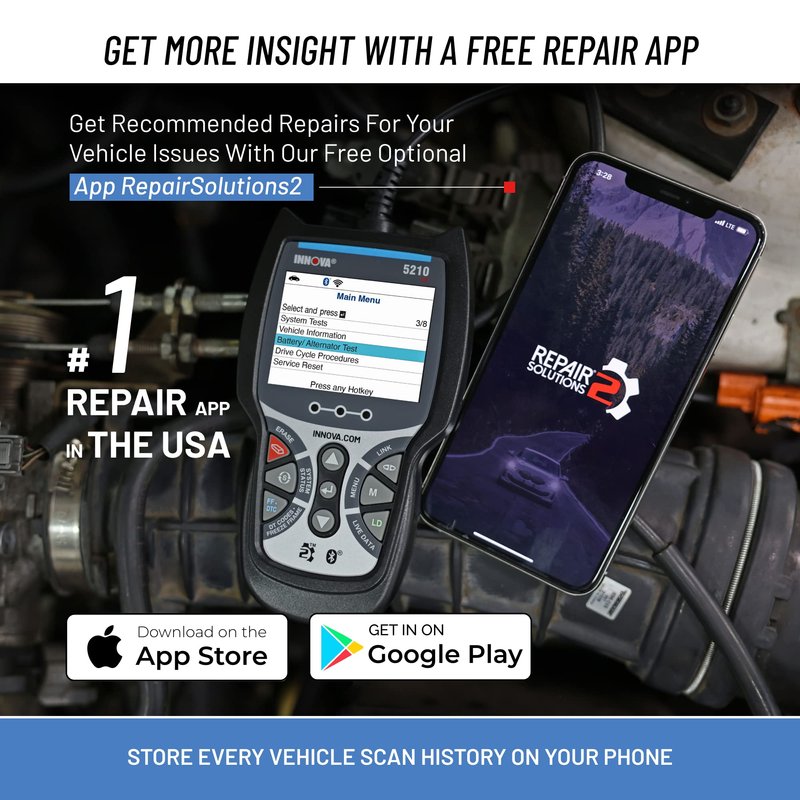 - MAINTAIN PEAK PERFORMANCE AND SAFETY ON THE ROAD - The 5210 OBD2 Scanner helps you easily find the problem and fix the problem. Use the mobile vehicle code scanner OBD2 Bluetooth application RepairSolutions2 on App Store or Google Play for real-time solutions and fixes to your automotive issues. With this app, get verified fixes, find and purchase the exact part required for repair, view maintenance schedules, buy parts, and access to Innova’s wireless OBD2 best-in-class database.
