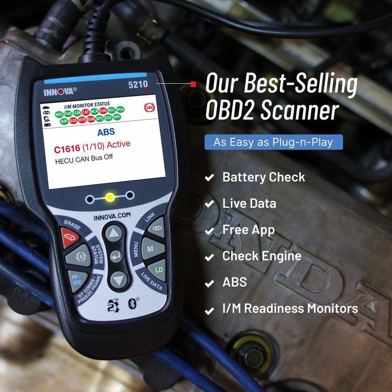 - LIVE DATA FOR MORE ACCURATE DIAGNOSIS - With the Innova 5210 OBD2 code reader live data you can see your vehicle’s essential information like RPM, speed, and oil temperature in real-time to help identify and correct problems. You can also check and test your battery and alternator, so you know whether you need to bring your car to a technician or not.