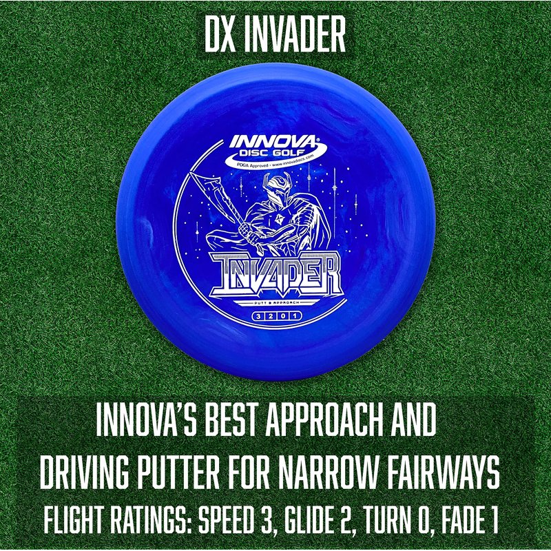 - DX INVADER – The Invader is Innova’s best approach and driving putter for narrow fairways. Its flat-top profile features a rounded, small bead rim making it easy to grip-n-rip straight flights. Put torque onto the Invader, it can handle it—backhand and forehand. 170-175g. Colors Will Vary.