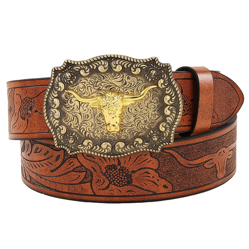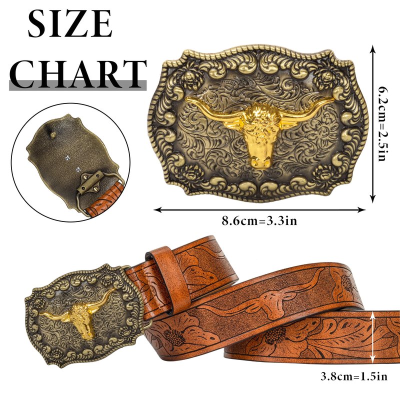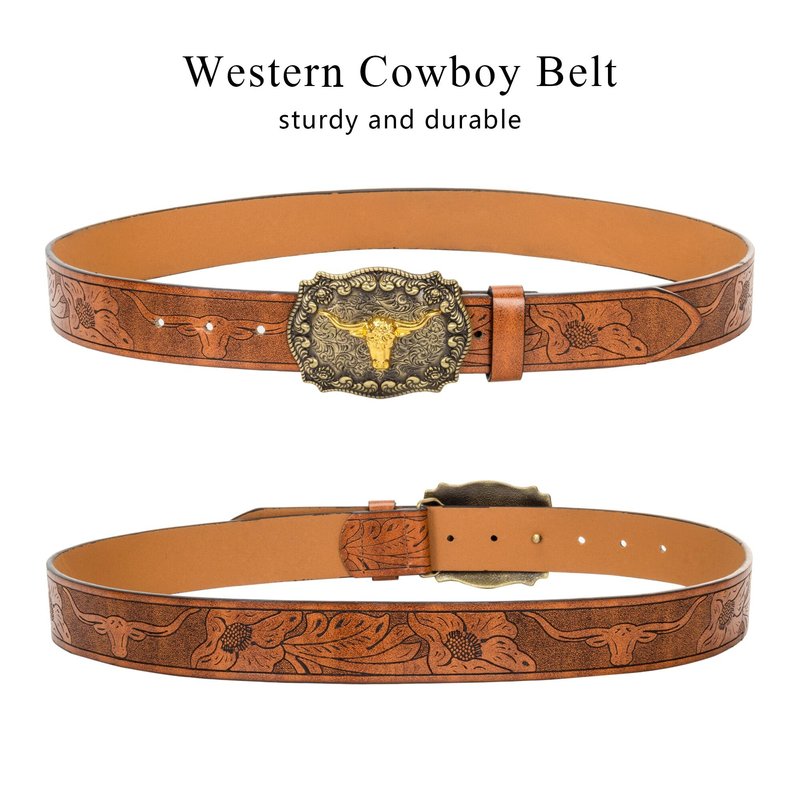 - 【Bull Head Buckle Style】buckles for men are designed with bull head, golden color of buckle and coffee belt are classic and eye catching, showing your charms and western feelings, making you stand out in the crowd,Faux leather belt, oval decor metal buckle, retro style floral carved design.