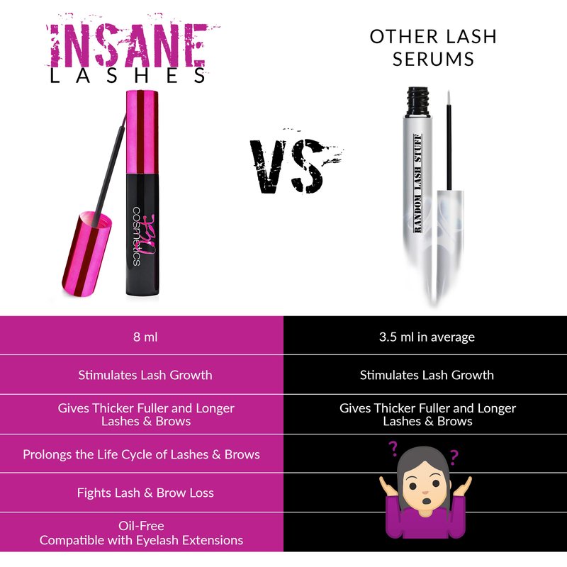 INSANE LASHES is the perfect Lash Growth Serum for those with short or thin Eyelashes / Eyebrows. Prolongs the life cycle of eyelashes and eyebrows while restoring their vitality and promoting better growth. Noticeably improves eye expression. Denser + thicker eyelashes and eyebrows in just a few weeks! FORTIFIES: Strengthens and tones. THICKENS: gives volume, body and thickens the stem of eyelashes and eyebrows. REPARATES: promotes, improves and preserves their elasticity. Improves resilience Regenerates dry, damaged eyelashes and eyebrows and their natural protection. REVITALIZES: Energizes, invigorates, gives shine and penetrates the roots for healthy-looking eyelashes and eyebrows. > PROTECTS: Protects eyelashes and eyebrows against external aggressions, damage caused by dehydration and physical damages such as breakage and peeling, which promotes better growth. HYDRATES: intensely and deeply. - Oil-Free, Fragrance-Free, Paraben-Free. - Can be used with eyelash extensions on or while wearing contact lenses! Made in Canada. INSANE LASHES contains 8 ml (2 X more than competing products) and is very easy to apply thanks to its thin brush applicator. HOW TO USE IT: Apply a very thin coat nightly, at the base of upper lashes and/or eyebrows, on perfectly clean skin, free of makeup, cream, dirt or oily residues. For best results, continue use for 3 months.