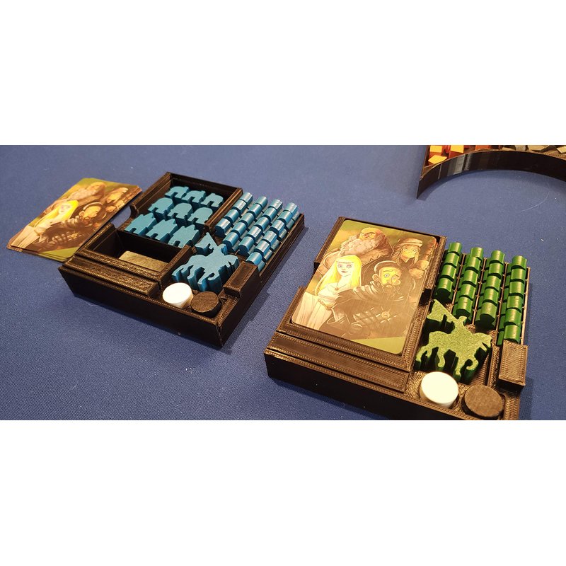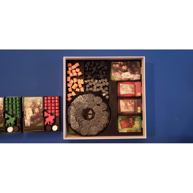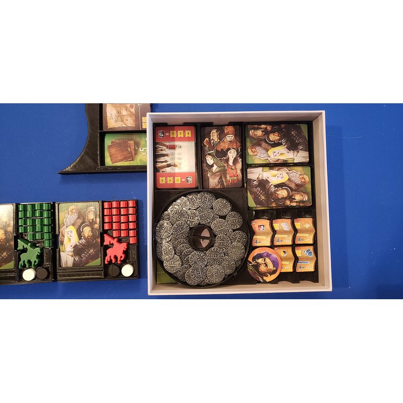 This is a box insert / organizing trays with individual player trays for the game "Viscounts of the West Kingdom"! While this game is great, the size of the box left much to be desired and everything is a bit difficult to get back in the box efficiently. This insert solves that issue and also is an extremely nice upgrade to the game. When your game group next meets to play this game instead of giving them a bag full of jumbled parts, you'll be able to give each of them their own tray with spots for each bit they need. Setup and teardown of the game is greatly simplified. The coin tray and bits tray are simply laid on the table and cards dealt from the card trays. This set will get Viscounts to the table more often and everyone will have a better time from setup to teardown! This is an original design lovingly developed by myself. If you have any other questions please don't hesitate to ask!