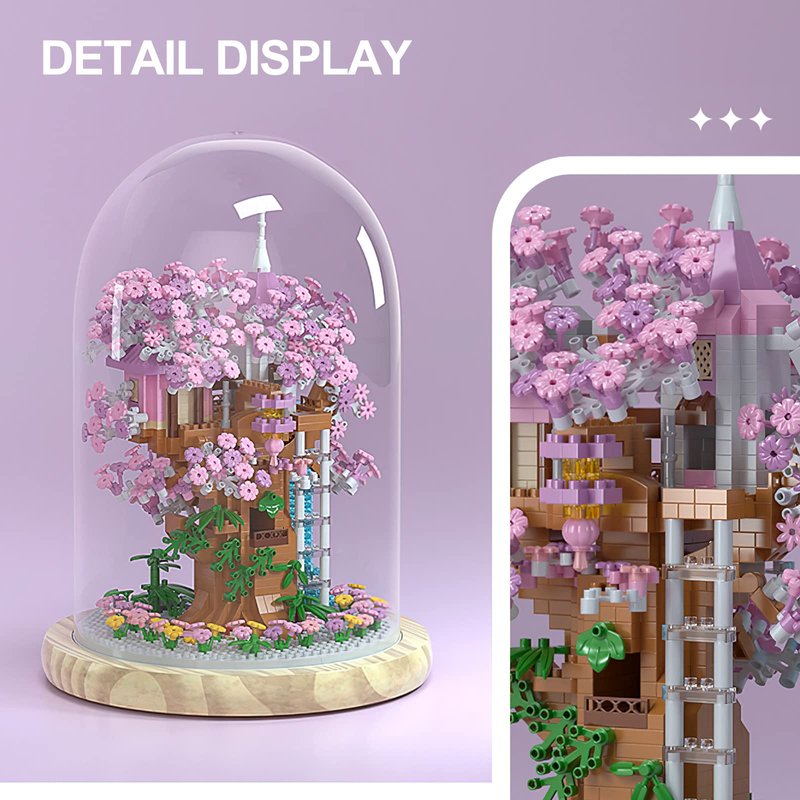 Insgen Cherry Blossom Bonsai Tree House Building Flowers Set for Adults, 1382 Pcs Micro-Particle Ideas Sakura Tree Building Blocks, Complete with String Lights, Dust Cover, and Wooden Base