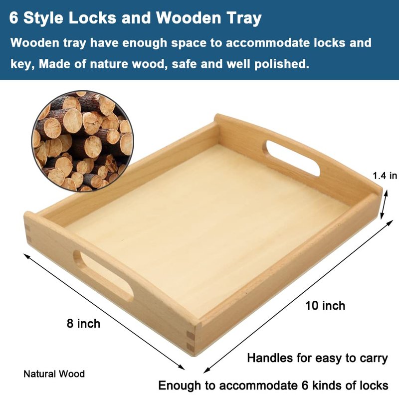 - 6 Style Locks and Key Toys for Toddlers: This montessori lock and key toy set includes 6 different locks, like as bronze locks, bear locks and combination lock, each style can catch childrens' attention. Password lock with an instruction to teach children how to use, The wooden tray have enough space to accommodate locks and keys and has handles for easy carrying