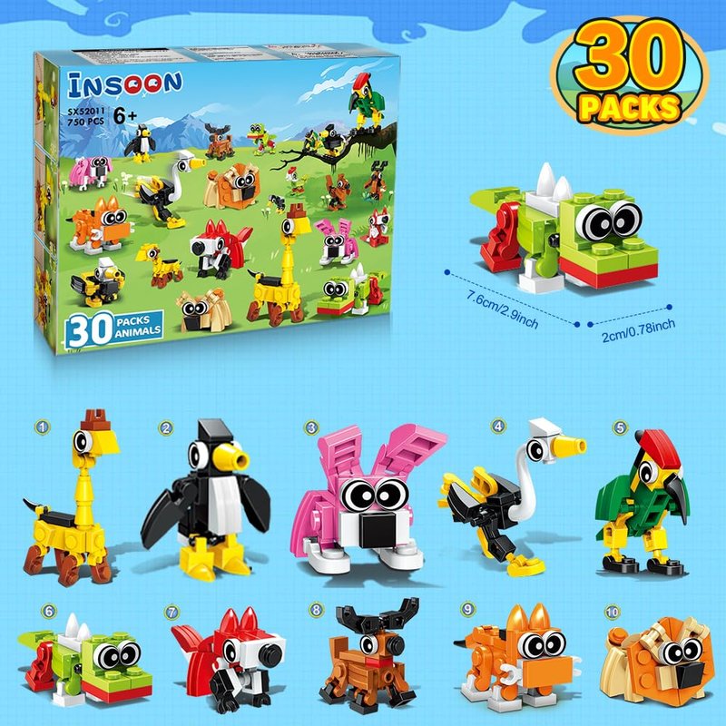INSOON 30 Pack Party Favors for Kids Building Toy, 750 PCS Animals Building Block Set for Goodie Bag Stuffers, Classroom Student Prizes Christmas Easter Birthday Gift for Boys Girls Ages 6-12+