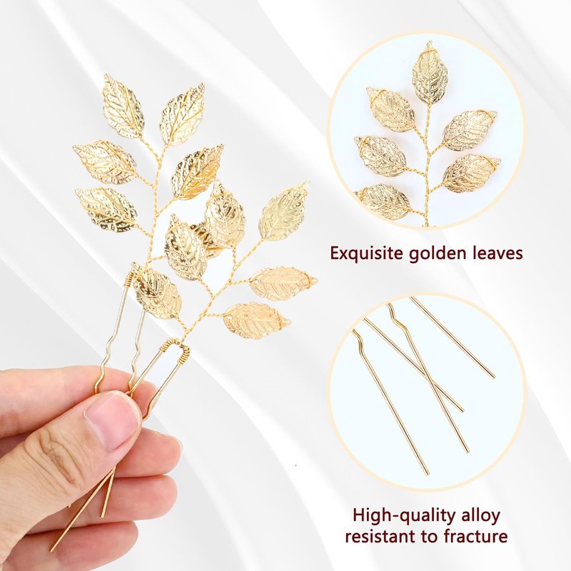 - High-Quality Alloy Construction: These elegant gold leaf hair pins are meticulously crafted using high-quality alloy, ensuring durability and longevity. The premium material guarantees that these hair accessories will withstand the demands of bridal events, weddings, and parties.
