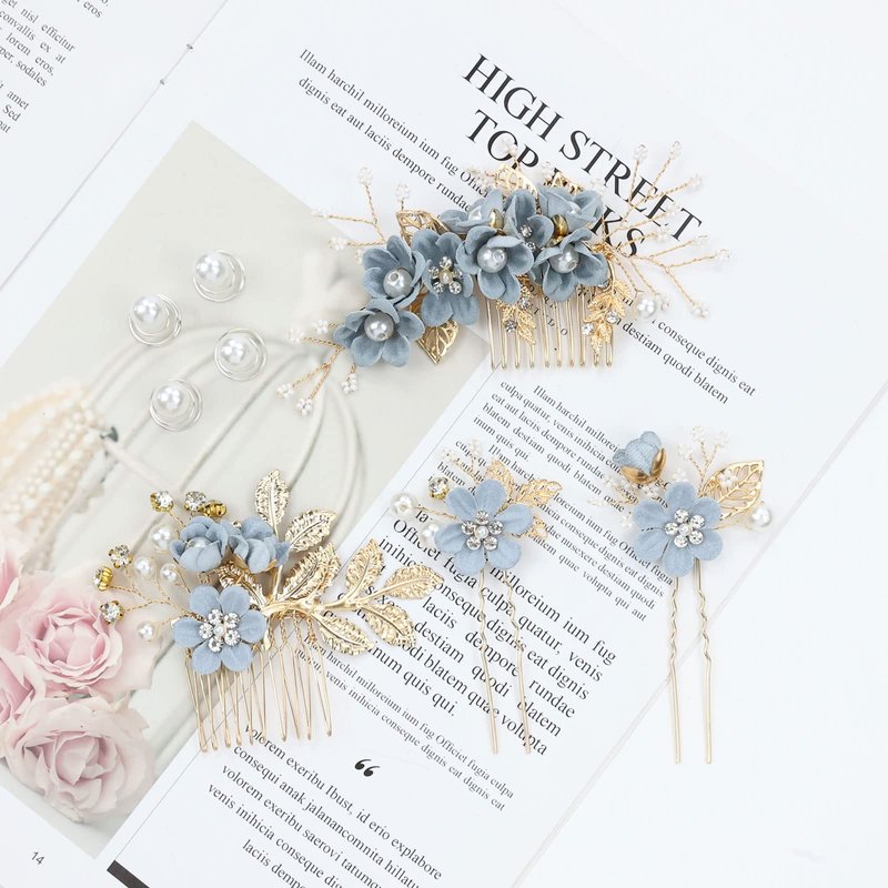 inSowni 20 Pack Classy Dusty Blue Flower Bridal Wedding Hair Side Combs+Floral Hair Pins+Twist Spiral Pearl Hair Pins Clips Pieces Formal Prom Headpieces Accessories for Brides Bridesmaids Women Girls