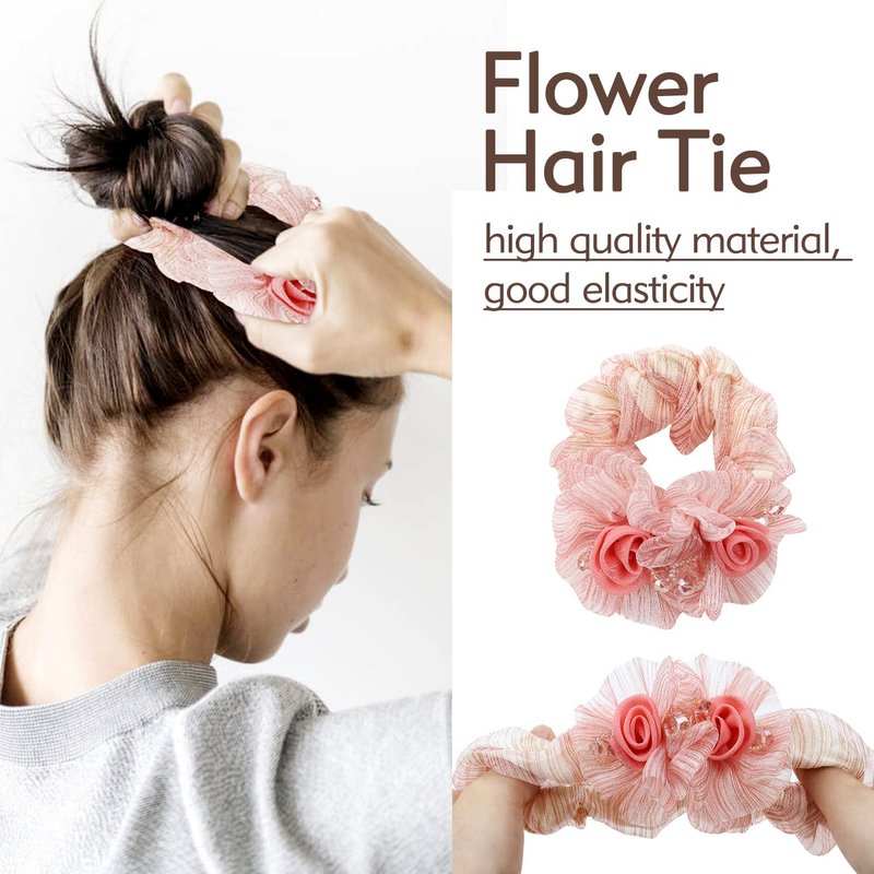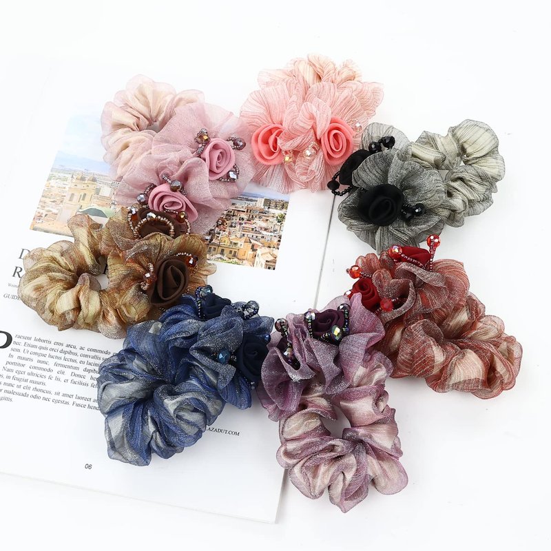 - Material: All flower hair scrunchies are handmade of high quality tulle with elastic rubber bands inside. Two roses on each hair tie are handmade of high quality satin and decorated with shining crystals, pearls and small beads which make them more delicate and pretty.