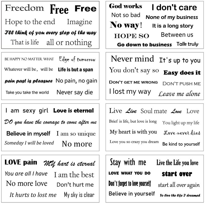 - Various Designs: 16 Sheets of fake temporary tattoo stickers, including 10 sheets of inspirational and motivational quotes and scripts, cursive words, retro typewriter style sayinging, 6 sheets of simple branch flower tattoos. Enough for friends party gatherings to enjoy together or choose different pattern to match your everyday mood.