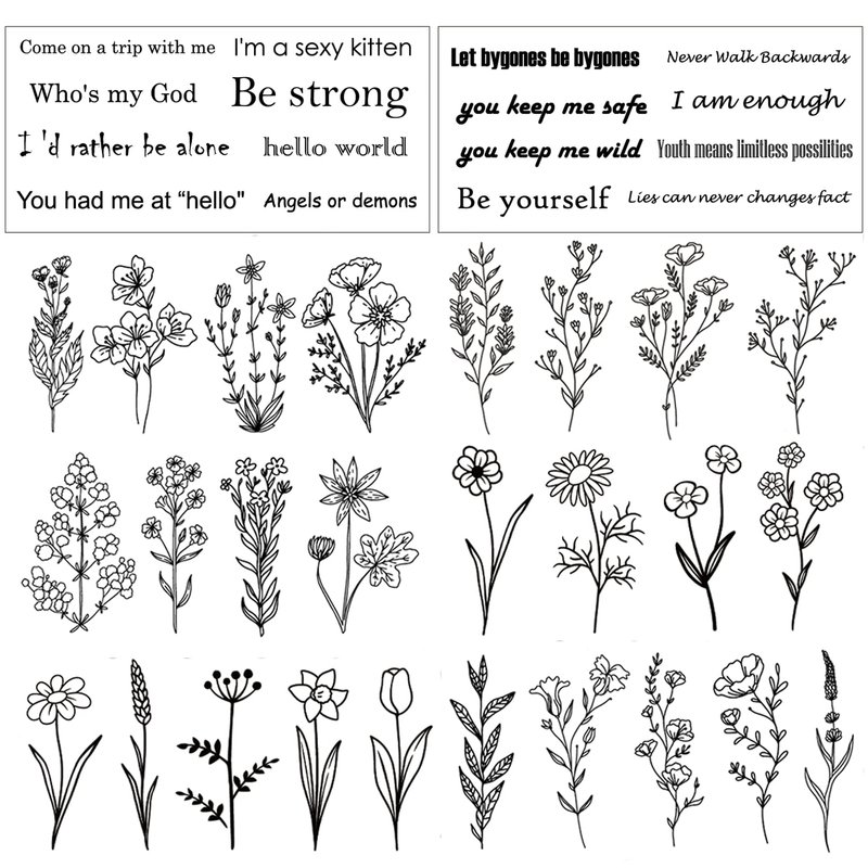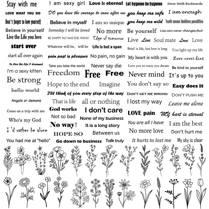 - Size & Design: Each sheet is 6.8x14 cm (2.7"x5.5") large. These semi permanent tattoos set is a perfect combination for both inspirational quotes and beautiful stylish floral desgins. Not only there is many powerful and meaningful scripts phrases and letter, but also a variety of wild flower designs.