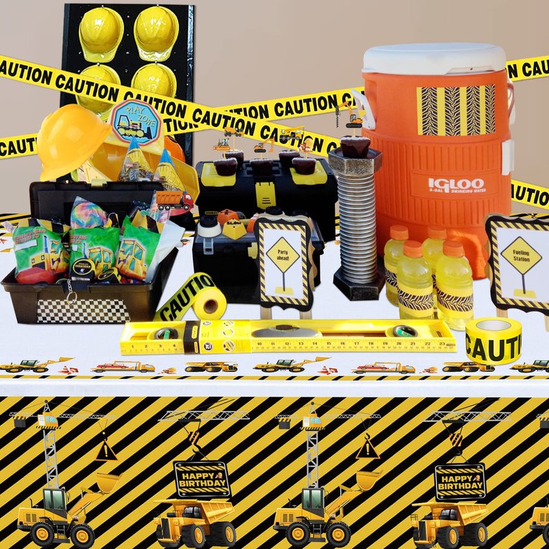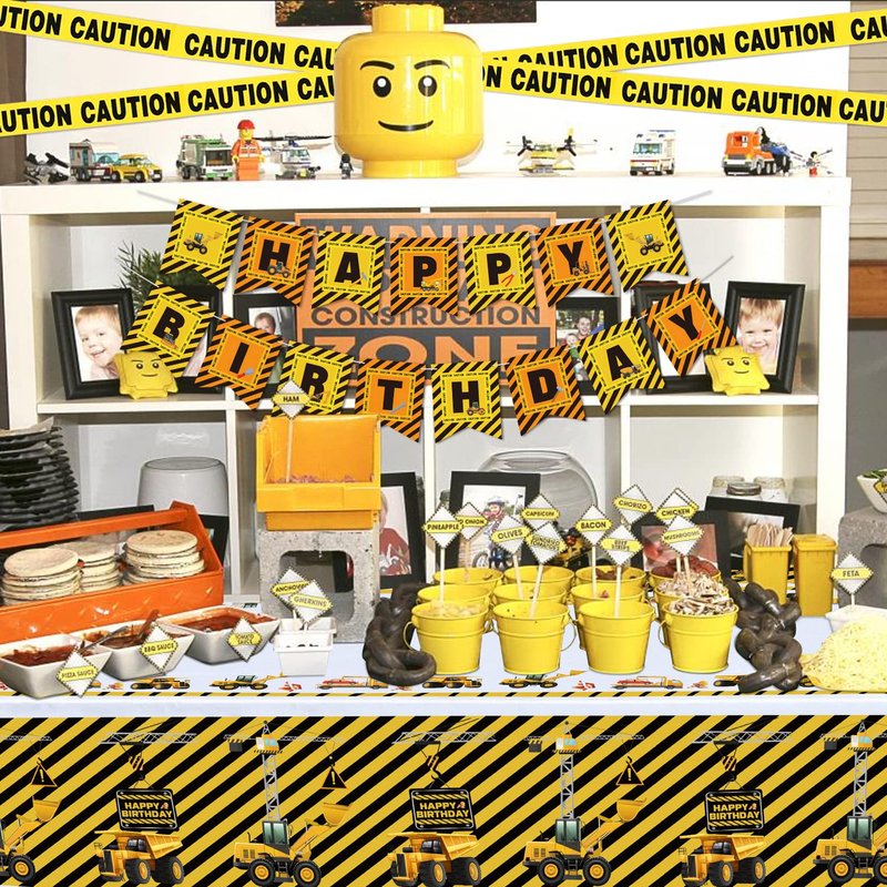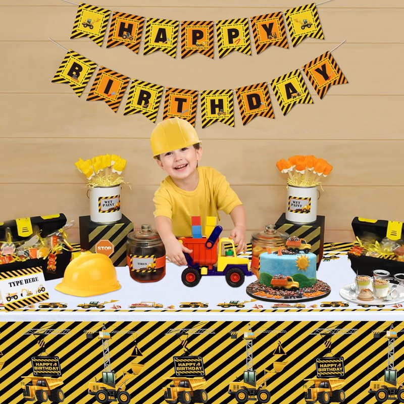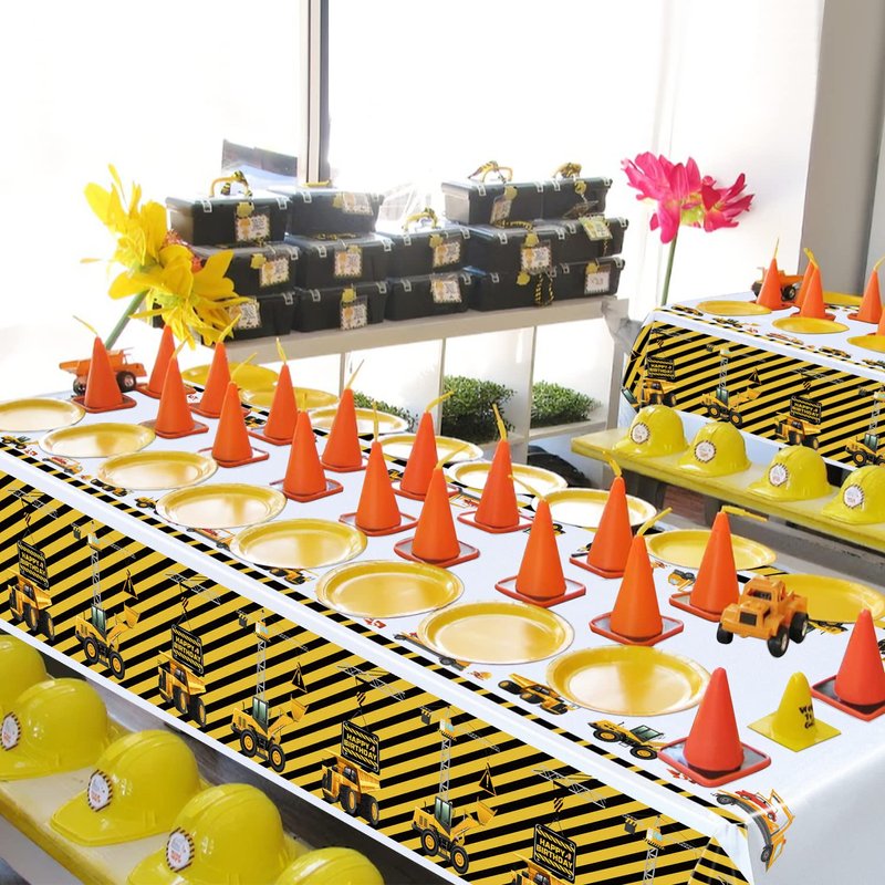 - PERFECT FOR MANY OCCASIONS: These cute and eye-catching pattern tablecloths add a festive touch to your construction themed party. Designed for Kids Construction Theme Birthdays. Designed with an exquisite style, as for the yellow and black striped background, the advanced printing process makes the characters more vivid and colorfast. Make your construction birthday party decor unique with these awesome party decorations