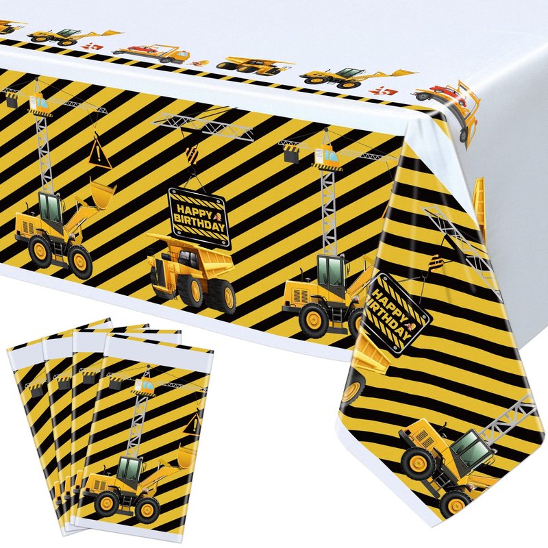 - 4 Pack Construction Theme TABLECLOTHS: Bright yellow, black and white construction tractor birthday Tablecloths made of High-Quality Plastic Material that do not rip or tear easily. Each package includes a Pack of 4, Rectangular Table Covers that Fit Most Average Sized Tables