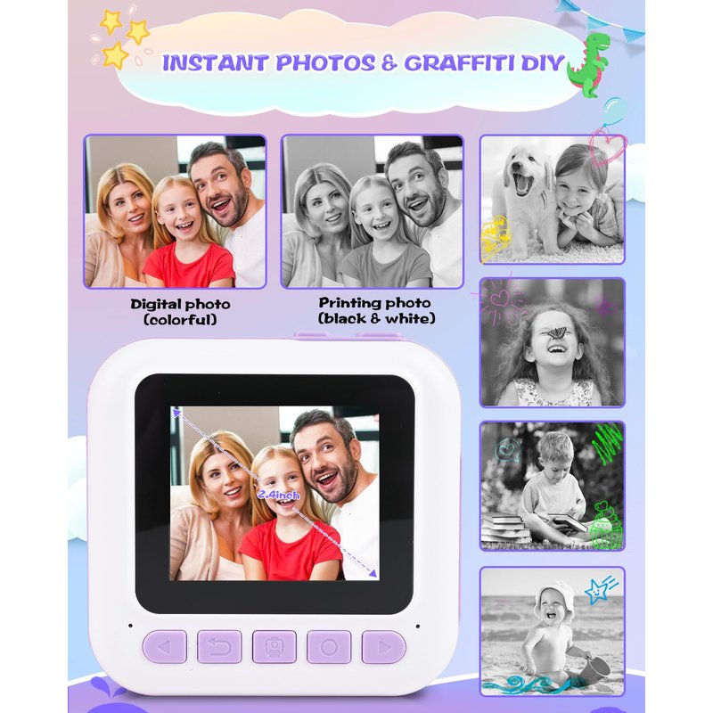 - Fun Kids Camera: Capture your child's imagination and cultivate their creativity with our kids instant print camera that produces black and white photo in just one second. They can also store their colorful photos on the SD card and take advantage of the camera's 10 scene filters and 16 sticker options. 3 rolls of printing papers which can print 200+ photos, and 5 color pens are included for graffiti DIY