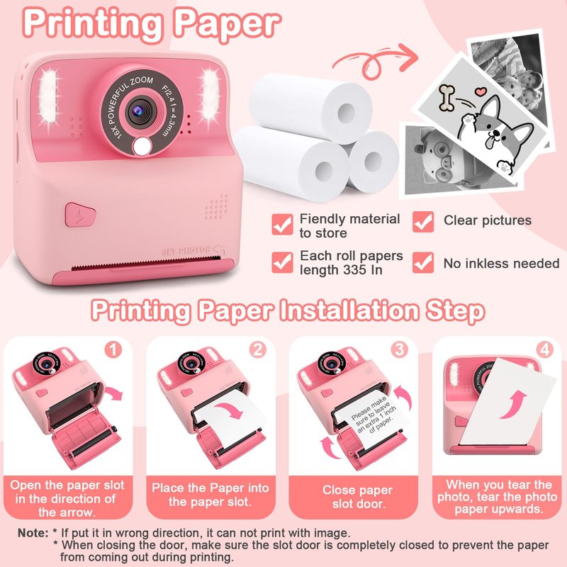 Instant Print Camera for Kids Christmas Birthday Gifts for Age 3-12, 2.4 Inch Screen Inkless Selfie Digital Camera, Toddlers Portable Travel Toys. It lets kids capture colorful photos and print black-and-white pictures. This camera enriches childhood and allows kids to showcase their creativity. They can easily share their favorite moments with family and friends. Ideal for birthdays, holidays, halloween, camping trips, thanksgiving, easter, and Christmas! Keep them off your mobile phones with their very own camera.