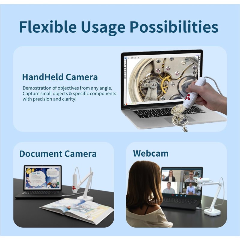 - [Flexible Handheld Camera] The handheld design empowers you to conduct hands-on demonstrations for diverse objectives from any location, effortlessly presenting small 2D & 3D objects, artwork, or architectural model clarity, without being confined to a specific position.