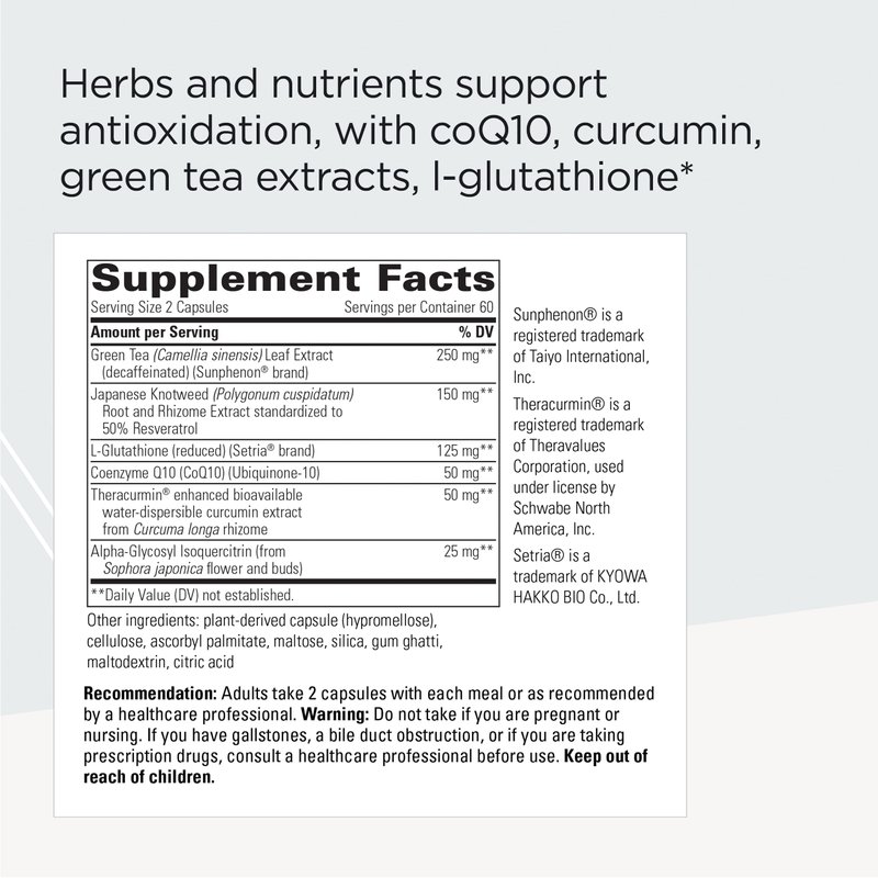 - Support Antioxidant Activity: The herbs and nutrients support antioxidant pathways with CoQ10, curcumin extract, green tea extracts, L-glutathione*