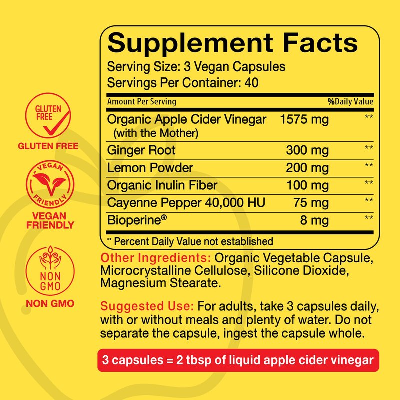 - UNIQUE FORMULA WITH ADDED INGREDIENTS - Our ACV capsules include inulin fiber, ginger root, cayenne pepper, and lemon powder. Experience a synergistic blend of natural ingredients for enhanced well-being.