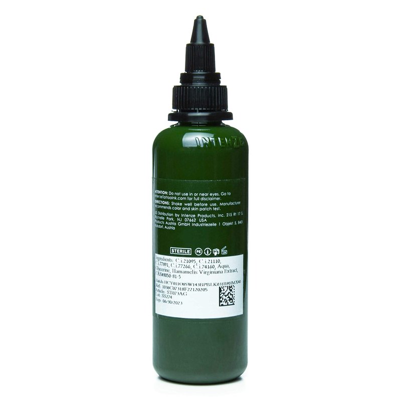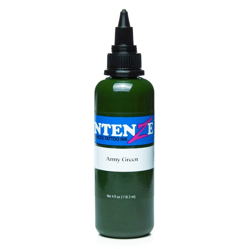 Intenze Army Green Tattoo Ink is inspired by the vintage army green color from the 1950's. It has been used for years in old-time and camo chic tattoos.