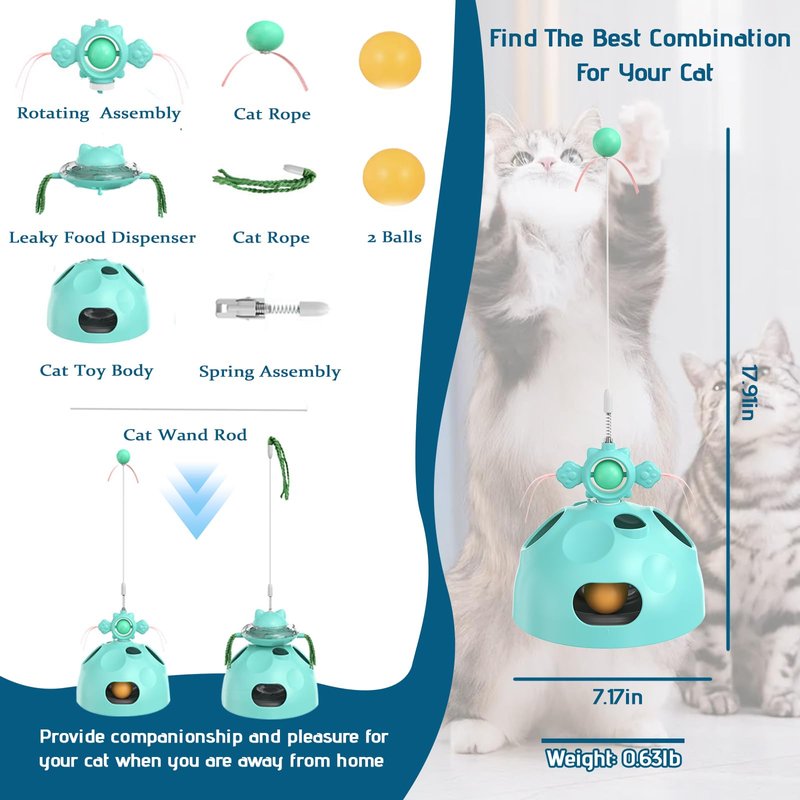 - Enrichment Toys for Indoor Cats--Toy includes1 cat toy, 1 cat rope, 1 rotating ball assembly, 1 cat ball, 1 leaking food assembly, 2 balls, 1 spring assembly, 1 cat rod.Assembling toys can be done according to instructions or videos. The components that come with the toy have been extensively tested and are completely safe
