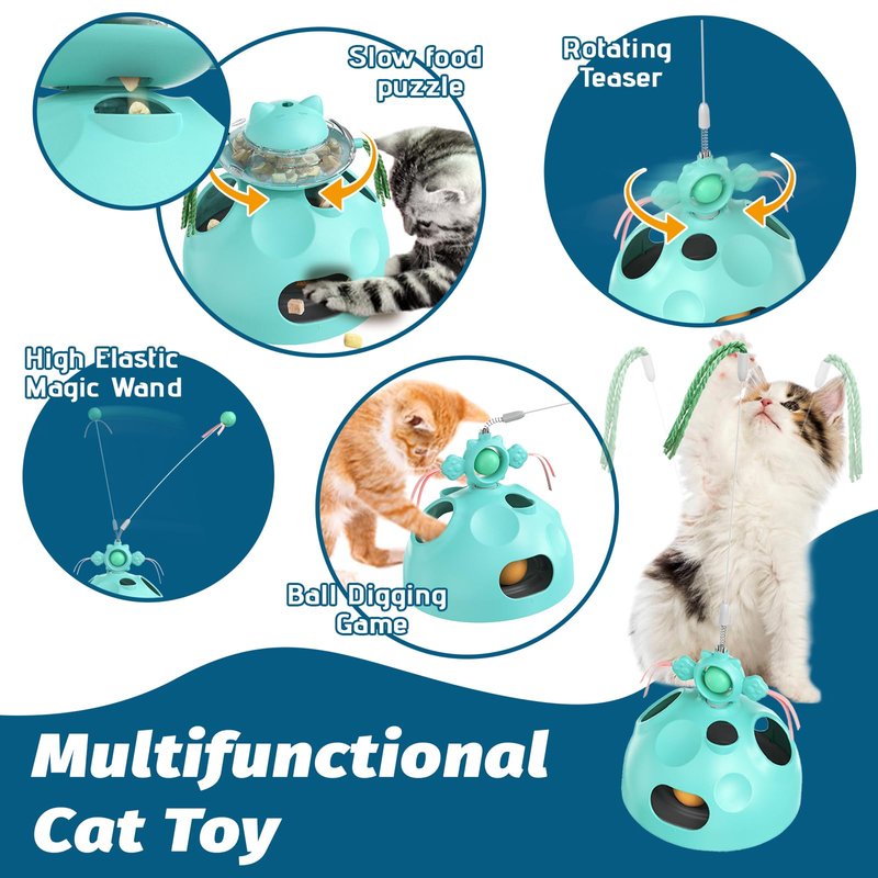 - 4 In 1 Interactive Cat Toy-- This toy are two interchangeable tops, one that holds treats and one that has extra tassels.These two modules can be assembled with the main toy body the top can be fitted with a cat teaser wand, and the body is dug holes to hide ball cat toys to meet the needs of pet cats to play