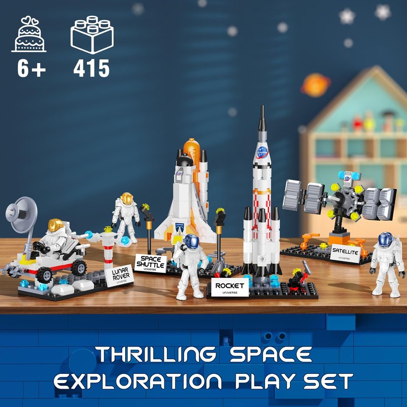 - EASY TO FOLLOW & BUILD: This 415-piece fun building toy for boys, girls, and kids ages 6 and up includes everything kids need to build a space shuttle set, rocket kit, space satellite, lunar rover, 4 mini astronaut figures. It is made of high-quality durable ABS plastic. Repeatable assembly ensures long hours of play. The instruction manual has clear instructions and colorful graphics clearly show how to assemble, allowing children to follow the clear building steps more effectively.