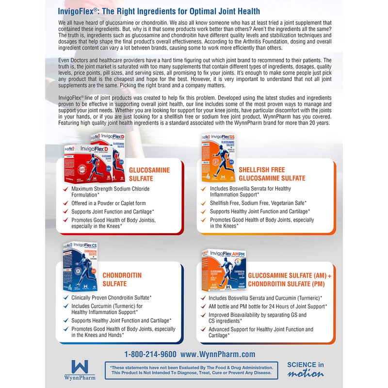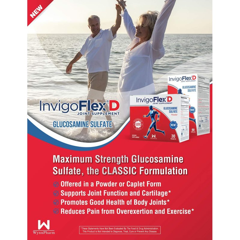 Keep those joints moving and get back to what you love doing. If you suffer from joint discomfort, InvigoFlex D can help. InvigoFlex D is the newest addition to the InvigoFlex brand. It contains 1500 mg of Glucosamine Sulfate, the CLASSIC formulation. Years of activities from sports to daily tasks place a great deal of stress on the joints. Cartilage wears thin, and in time, it breaks down. InvigoFlex D is used to help support joint health and maintain and promote healthy cartilage. Classic Glucosamine Sulfate Maximum Strength Formulation Supports Joint Function and Cartilage* Promotes Good Health of Body Joints* Reduces Pain from Overexertion and Exercise* Available in Powder or Caplet form* Physician Recommended. Available without a prescription* Glucosamine Sulfate, the CLASSIC formulation. Many products offer different types of Glucosamine (i.e. Glucosamine Hydrochloride) and provide different quality levels, and different dosages. With InvigoFlex D, we set out to create a product that customers could trust for superior quality and efficacy, using ingredients that could help support joint health when you need it most. One of the most important parts of your life is the freedom to do the things you have always enjoyed doing, without worrying about joint discomfort. Choosing the right product to help with this has never been more critical. InvigoFlex D is there to ensure you no longer have to worry about choosing the wrong joint supplement.*