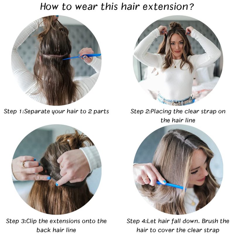 - [Apply Steps]: 3. Secure The Hair Extension with 4 Clips, Hide The Wire with Your Own Hair; 4. Put Down The Top Hair and Comb Your Own Hair and Extensions to Make It More Natural Look