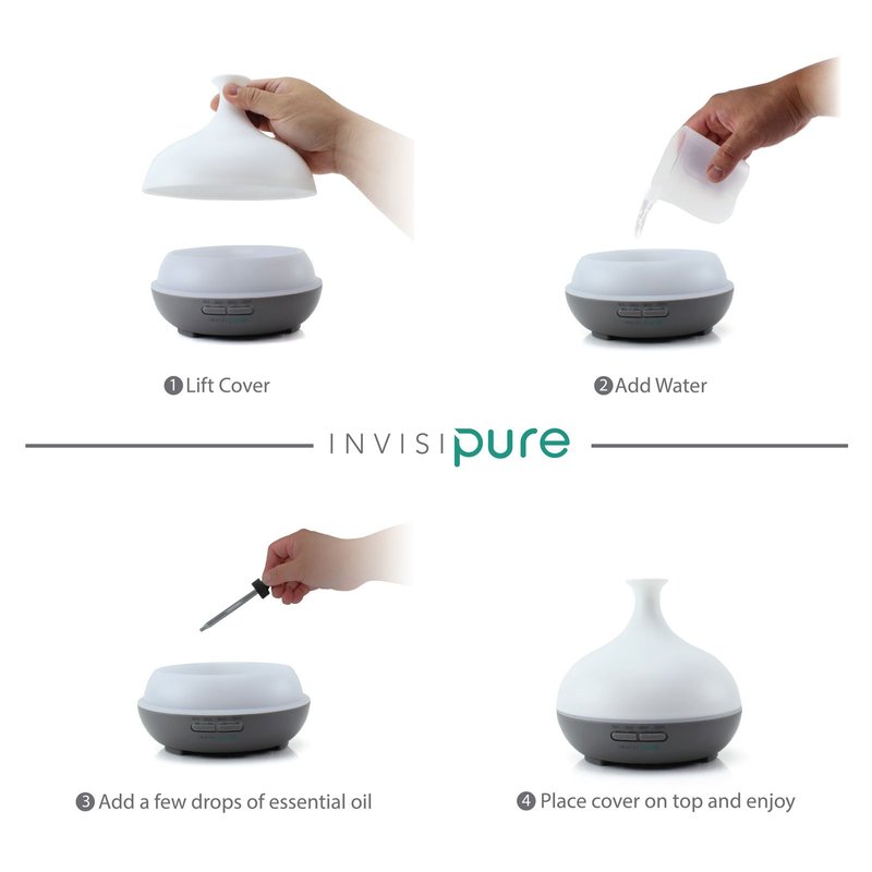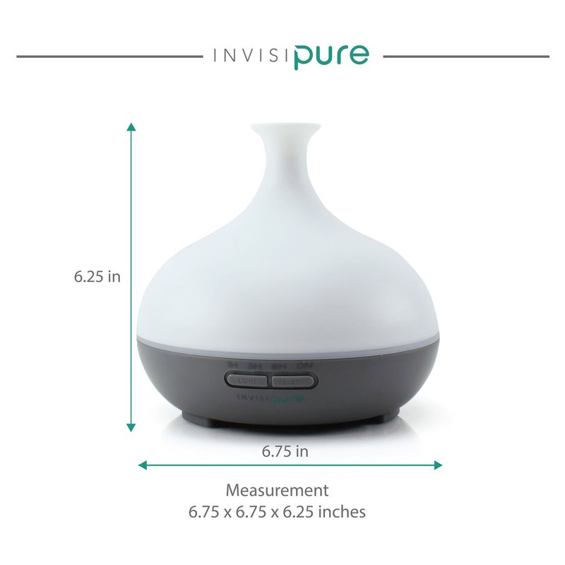 The InvisiPure Drop Aromatherapy Diffuser and Humidifier will diffuse your favorite essential oils and humidify your room. Our premium diffuser features dual water level sensors to increase reliability and safety. Nightlight feature is great for kids and soothing relaxation before bedtime.