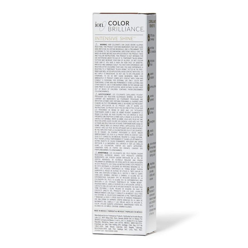 ion Color Brilliance Brilliant 12 Ultra Gloss takes hair color to the next level by giving you the custom color you expect from ion then layering on the super high shine that makes hair look healthier silkier and more vibrant than you ever dreamed possible. This ultra gloss features a luxurious Italian formula which provides long lasting color serious anti-fade UV protection and even 100% gray coverage. Luxurious pigments cover evenly while our lustrous high-gloss finish hydrates deeply and leaves hair feeling soft stronger and smoother. ion Hair Color's superior quality proprietary blends are formulated in Italy by our expert team of chemists to deliver unparalleled results. Our unique system combines the finest quality natural and exotic ingredients with powerful high-tech compounds to achieve exquisite brilliant color with superior gray coverage. ion Hair Color science relies on the power of micro-pigmentation-our microscopic pigment molecules oxidize slower allowing them to penetrate deep into the cortex of each hair strand for long-lasting fade-resistant color. Our formulas are PPD-free and enriched with Hyaluronic Acid Argan Oil Pequi Oil and botanicals to nourish and strengthen hair from within. Not to mention ion Hair Color is gentle on hair containing up to 38% less ammonia than the leading professional brands on the market. Unlock your hair's true potential with ion's cutting-edge salon-quality color science and vibrancy like never before.