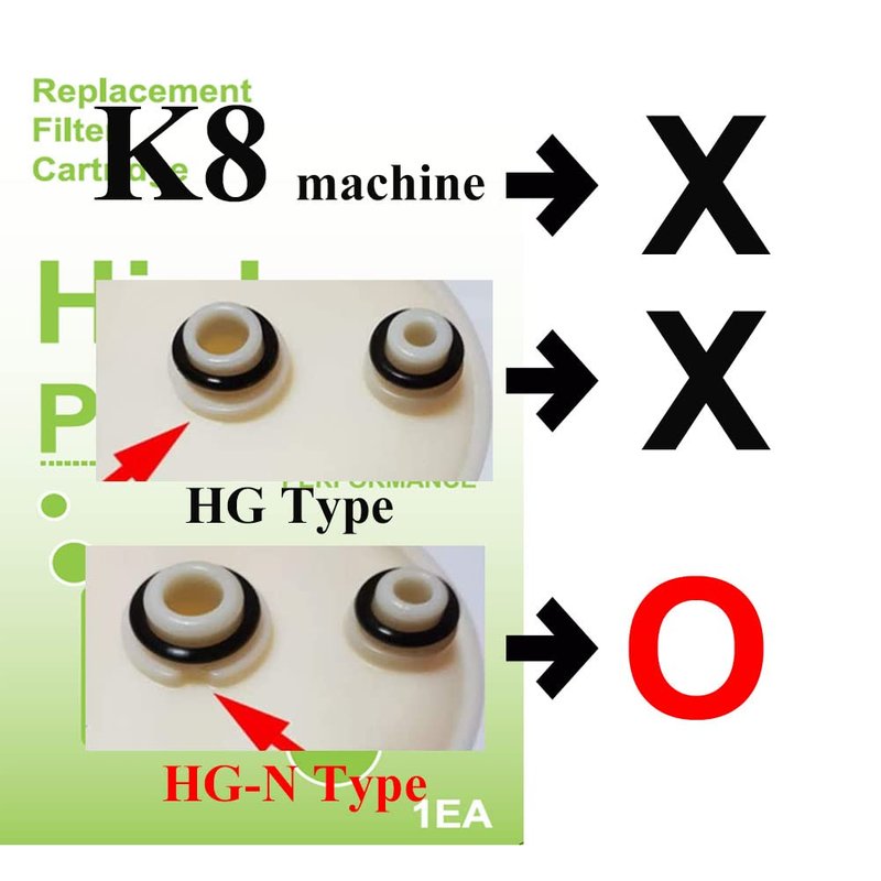 -Compatible Replacement Ionizer Filter compatible with HG-N typeToyo Ange Impart (ONLY FOR NEWER MODELS sold after January 1, 2011); NOT compatible with K8 machine; NOT compatible with the original HG type machines. -Using high-quality material only. -Filter replacement interval: Approx. 6 months (depending on the water quality) -Filtration Capacity: 12,000L (depending on the water quality) *This is a compatible replacement filter made by Korean manufacturer. Made in Korea -Compatible with water ionizers using the HG-N filter. -Contains Granular Activated Carbon (Flushing Process is required after installing new filter. During the Flushing Process, black water may come out for a short time.) *This filter is NOT compatible with the OLDER machines (Sold BEFORE JAN. 1 2011) which use HG type filter. The HG-N type filter has TWO notches (indents) on the centered hole rim of filter and machine. PLEASE OPEN THE FILTER COVER AND CHECK YOUR OLD FILTER AND THE FILTER BASE! Use the Cleaning Cartridge every 6 months to maintain the performance of ionizers. 1. Power off the unit and unplug it. (Be certain to shut off the faucet. Never power on the unit during cleaning procedure.) 2. Remove the filter (Check if both o-rings were removed from the filter base.) 3. Install the cleaning cartridge. 4. Place the flexible hose and the secondary hose into a cup. 5. Turn on the faucet until both of the hoses are fully submerged. 6. Leave the unit sitting for 3~5 hours. (Best to sit overnight) 7. Return the flexible hose and the secondary hose to their positions. 8. Turn the water on and let run for 5~10 minutes. 9. Turn off the water. 10. Remove the cleaning cartridge and install the water filter. 11. Place the filter cover back to the unit. 12. Let the water run for 3 minutes. 13. Plug the unit back in and turn on the power. For more detailed instruction, please search the keywords, “ How to Clean Water Ionizer”