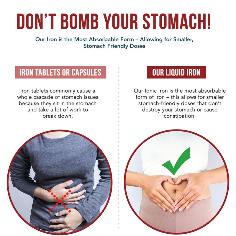 - HIGHEST ABSORPTION RATE = SMALLER DOSE & LESS STOMACH ISSUES: This is the most bioavailable form of iron in its natural ionic form. The increased bioavailability allows you to take smaller doses and avoid stomach irritation or constipation. The liquid form also allows it to be immediately absorbed through the intestine without any work by the stomach.