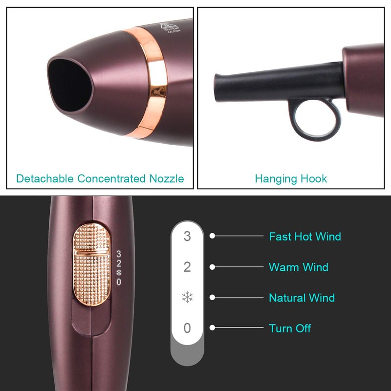 - Anti-Scald Concentrator Nozzles : Concentrator nozzle, featuring fast drying and precise molding, and unique air comb, integrating combing and smoothing hair in one step in the course of drying.