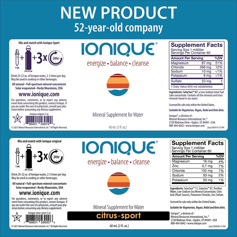 - MINERAL-RICH GOODNESS FROM UTAH’S GREAT SALT LAKE No added sugar. Nothing artificial. Our modern diets - and our water - lack minerals, and we are suffering the consequences. Ionique’s dual system corrects this damage cycle. Make your own premium mineral water with Ionique. You’ll feel empowered doing something so simple and GOOD: supplementing naturally with ionic sea minerals - the form best and most quickly absorbed by your body.