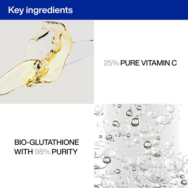 - HIGH POTENCY VITAMIN C & GLUTATHIONE : Contains 25% pure Vitamin C and 1,000ppm Glutathione for powerful brightening and anti-aging effects. Patented dual-layer formula of water and oil bases stabilizes Vitamin C, preventing rapid oxidation.