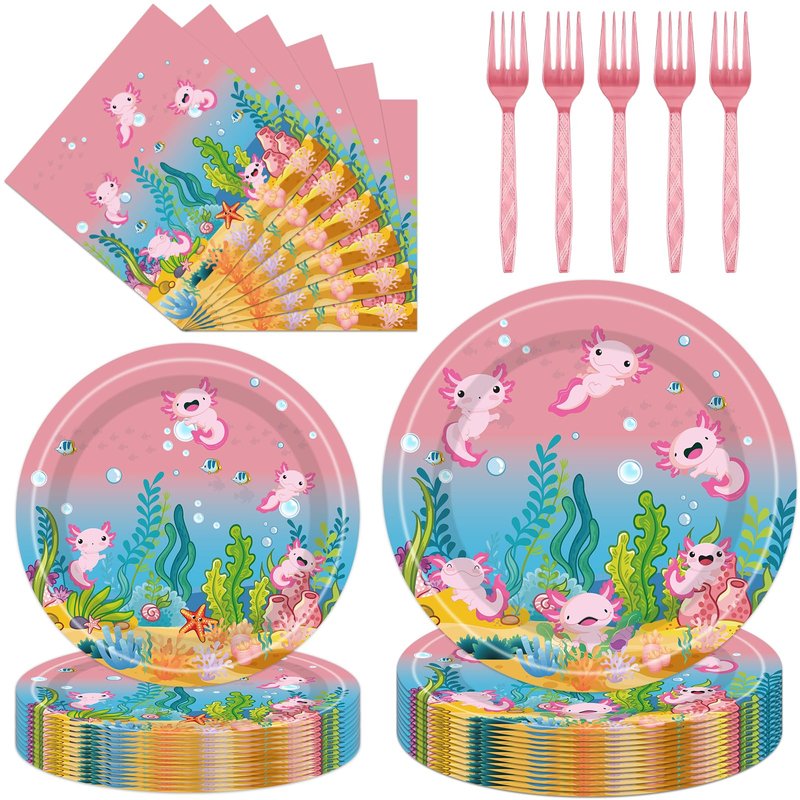 1.This set includes 24 small plates, 24 large plates, 24 napkins, and 24 pale pink forks, providing you with all the essential party supplies. Each item features exquisite axolotl birthday elements theme design.
