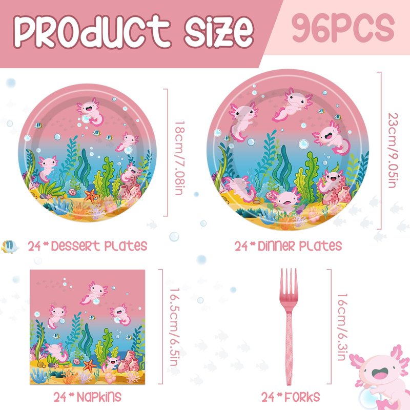 - Serves 24 Guests: Our axolotl theme pink plates party supplies comes with 24 pcs 9.45 × 9.45 × 1.97 inches large paper plates, 24 pcs small paper dessert plates, 24 axolotl napkins, 24 pink forks. Making it perfect for serving up to 24 guests