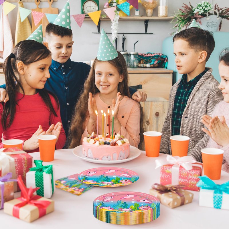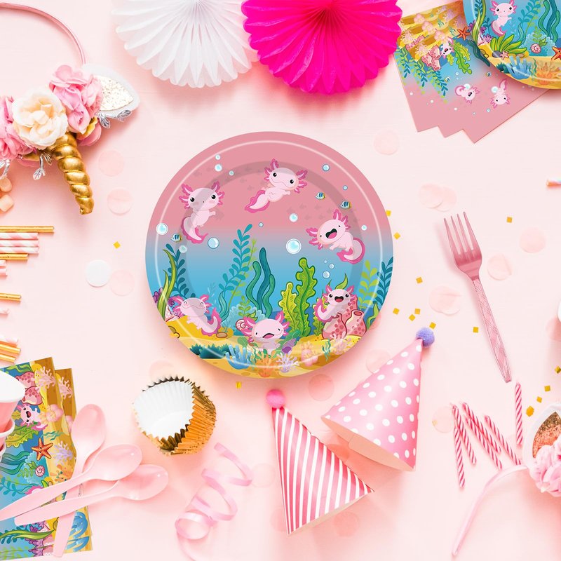 - Convenient: These pink axolot birthday party paper plates, folks and napkins are disposable after use, just throwing the paper plates cups napkins after the party, saving you time in cleaning up. Perfect for happy birthday party or baby shower