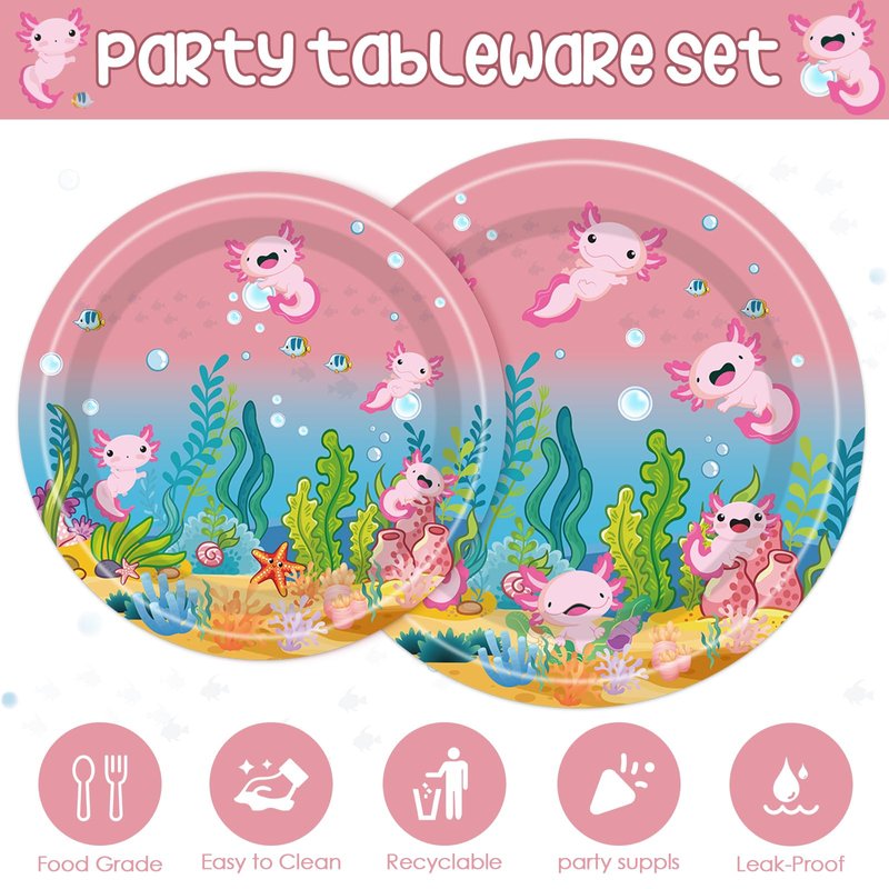 - High Quality: All our pink axolotl themed happy birthday party disposable tableware sets are made of high quality paper, non-toxic, odor free, thickened and sturdy, which can hold up well with any kinds of food. that is thicker and sturdier and can handle hot, cold, and wet foods without leaking. perfect for desserts, cake, party food, and drinks