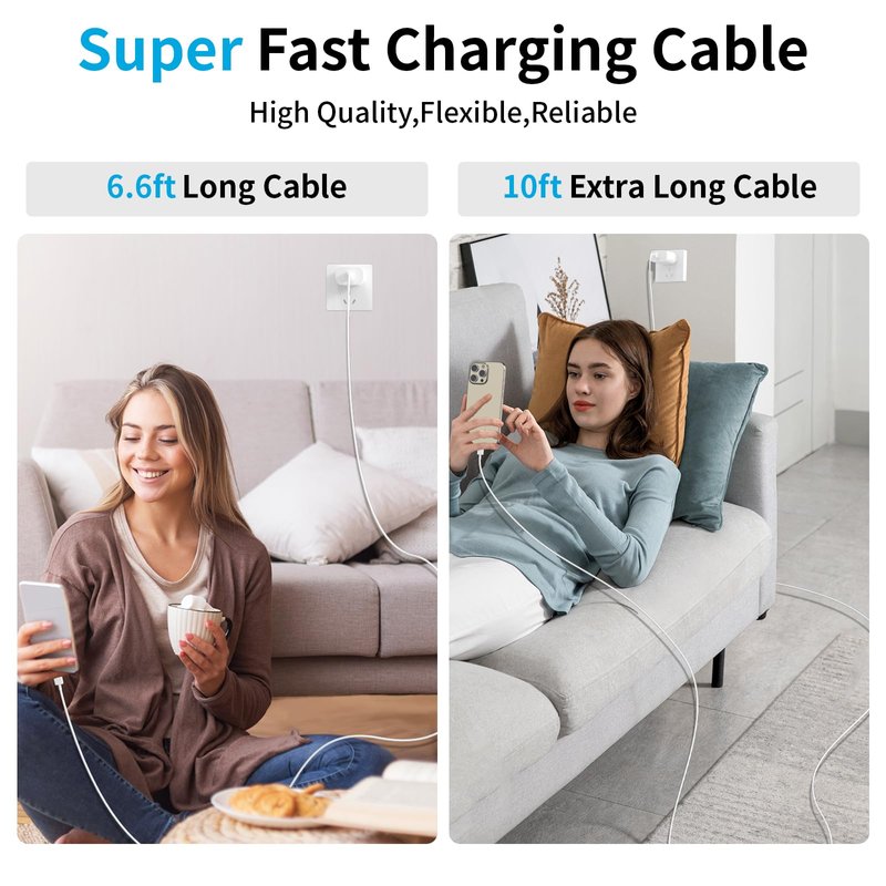- 【30W iPhone 16 15 Fast Charger】PD 3.0 quickly charge USB C port provides 4X faster charging speed than original 5W iphone chargers do. It can charge iPhone 16 up to 65% in just 30 minutes which saving over 1.5hrs for you. The PD 30W iPhone 16 15 Charger USB C Block with 10ft extra long USB C to USB C fast charger cable cord provide Max 30W output power,10% faster than the original 20W USB C charger