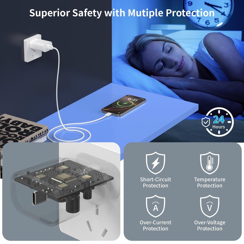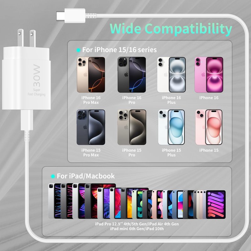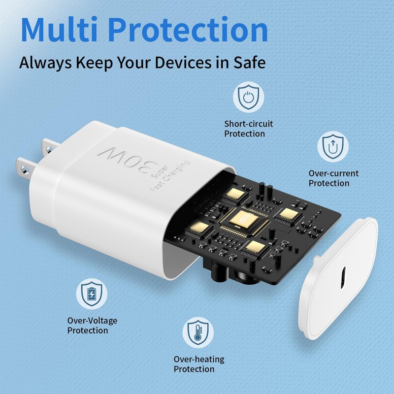 - 【 iPhone 16 15 Safety and Reliable Charger Block】30W USB C Charger Offers Multiple Safeguards Automatically. ETL,FCC,CE, ROHS Certificated. Multi-Charging Protection Keeps Your Device Safe From Over-Current Over-Voltage Over-Heating & Short-Circuiting. Exhaustive Protection While Charging.The UL certified wall charger built-in over-voltage protection,features a stable voltage. the USB C cable built-in smart chip to match the current required by devices automatically.