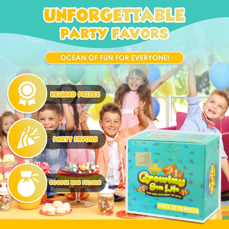 - INCLUDES 52 ASSORTED SEA CREATURE TOYS: Each set comes with 52 unique, mini sea creatures in various shapes and random colors, ideal for party favors, classroom prizes, and goodie bag stuffers. These conveniently sized toys, measuring about 2 inches before growing, are great for holiday games, birthday activities, or Christmas stocking fillers, providing fun and excitement for kids.
