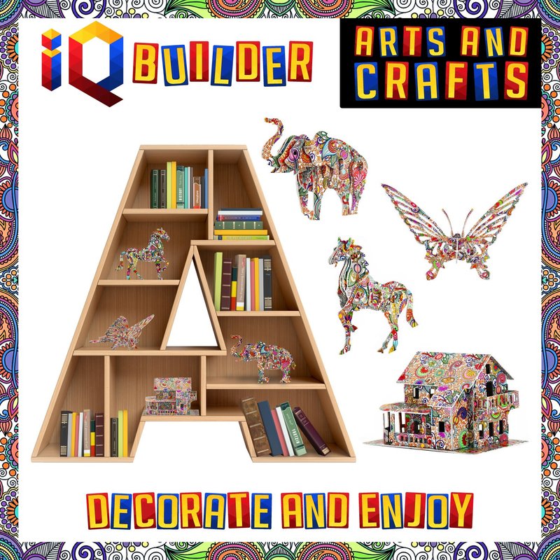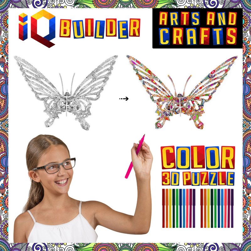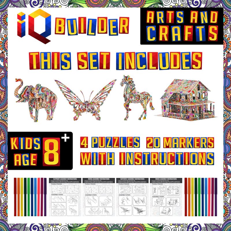 - ►3D COLORING PUZZLE SET INCLUDES MULTIPLE DESIGN OPTIONS ✮ This 3D Art Coloring Puzzle Set by IQ BUILDER includes a total of 4 Designs along with 2 packs of 10 Coloring Markers. You get to Assemble and Color 3 Animals including a Butterfly, Horse and Elephant along with a larger House. This is more than enough to keep you Engaged for Multiple Hours. Please also see our other Sets available on Amazon! ✮