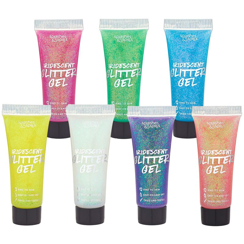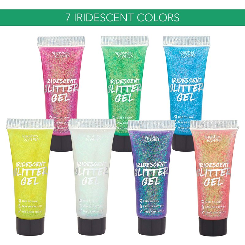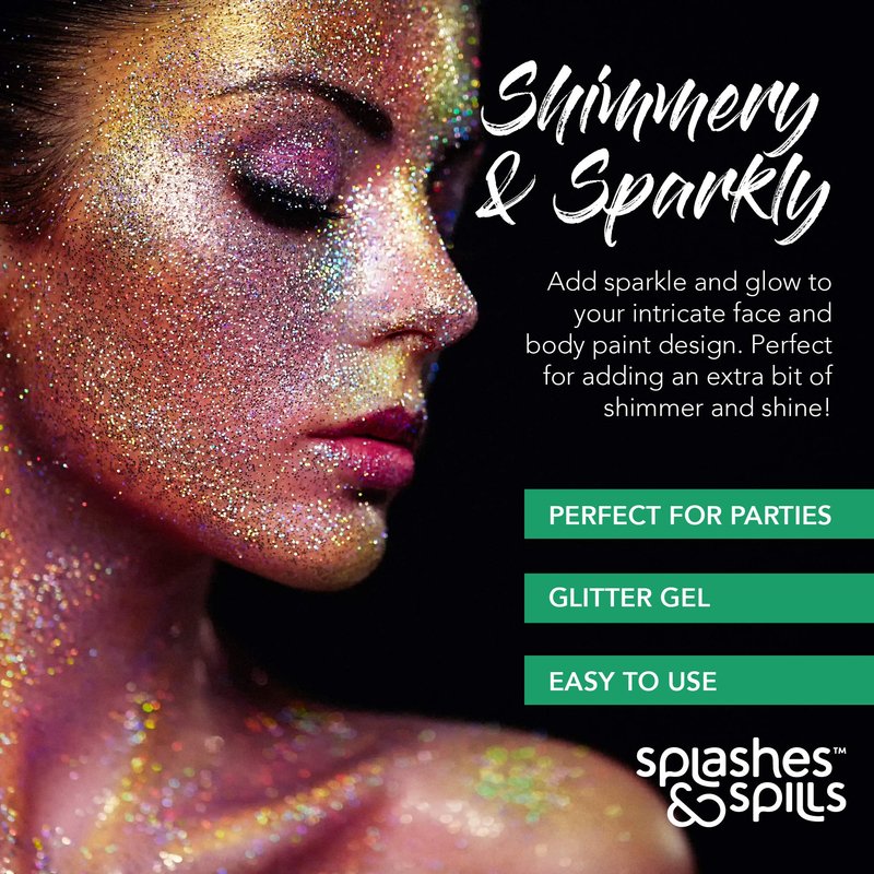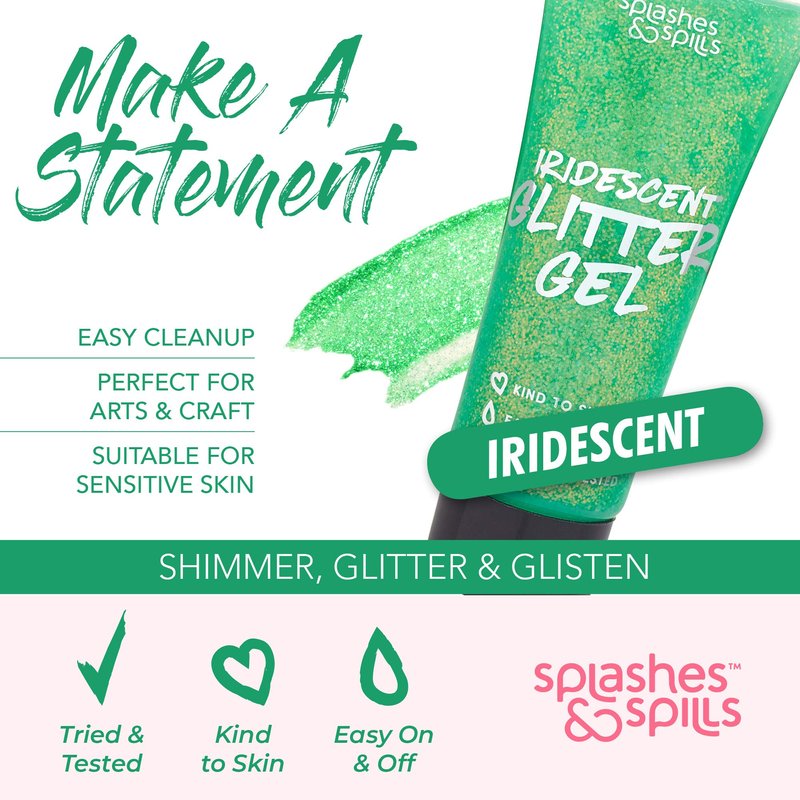 - IRIDESCENT GLITTER GEL MAKEUP: Add a rainbow spectrum of shimmer to your face and body paint. Splashes & Spills Iridescent Glitter Gel is great for your hair too! Stand out in a crowd when you create your own mermaid look.