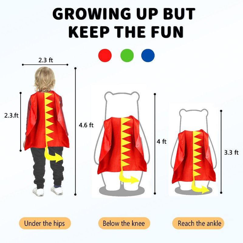 - One Cloak, Many Wearers: Our dragon capes (W 27.5 inches x L 25.7 inches), feature adjustable hoops & loops, NO CHOKING HAZARDS for 3 to 9 Y/O kiddos. Girls boys dress-up costumes, crafted from 75D Imitation Silk fabric, enabling hours of uninterrupted play. Invite Parents to try on and join the Prehistoric Adventure.