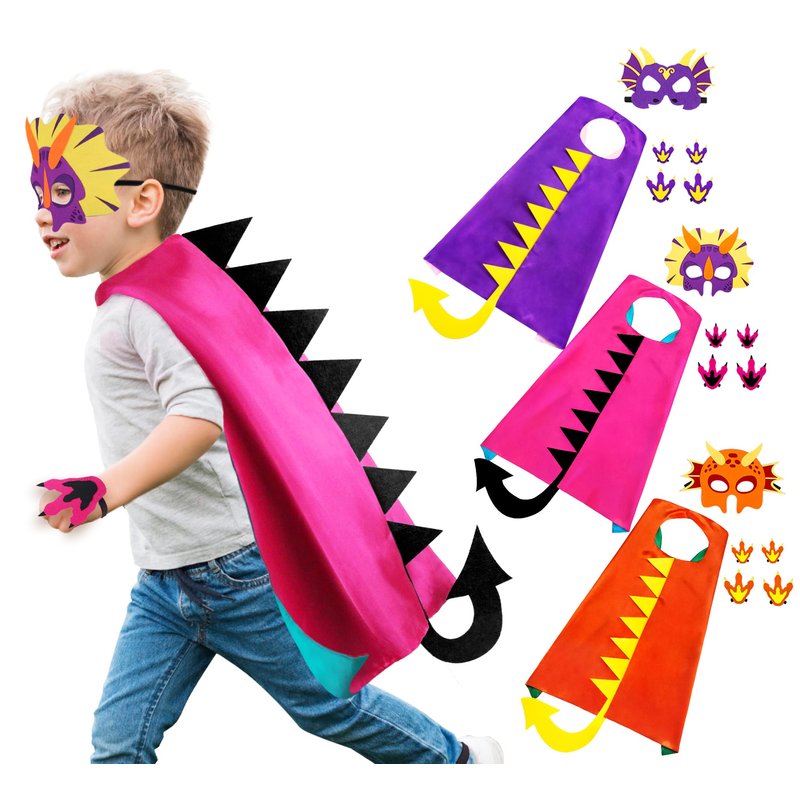 - MAKING FRIENDS - Dragon costume for kids, includes 3*dragon capes with 3D tail, 3*dragon masks, and 3 pairs matching dinosaur paws worn on hands and feet. Great way to make friends and play as their favorite dinosaurs or superheros! Easy to give away as gift!