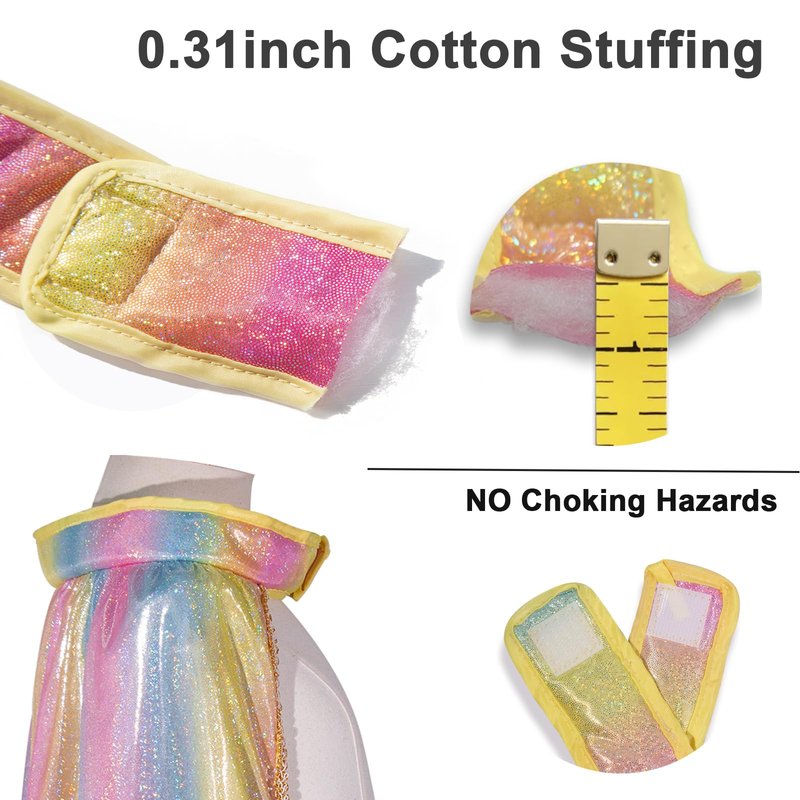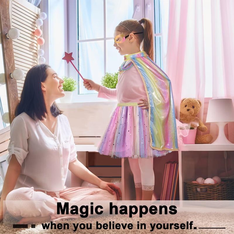 - No Glitter Bombs: Based on feedback from over 300 customers, we’ve enhanced our princess costume set to Fairy Tale Glamour 2.0, prioritizing your child's safety and comfort. The princess cape is made from luxurious shiny fabric, eliminating sharp sequins to prevent shedding—perfect for endless adventures in the magical world of make-believe