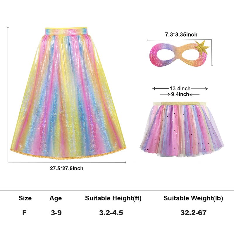 - A True Transformation: Get ready for royal ball dancing with our Princess Cape, Mask, and Tutu Set! The cape for girls features gold trims and a cushioned neckline for a snug, comfortable fit. Paired with a shiny star tutu skirt and a glitter mask, your little one will love twirling and bringing fairy tales to life